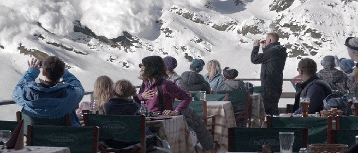 During lunch on their second day they observe an avalanche heading towards them. The couple’s instinctive split-second reactions set up the crisis played out throughout the film. The mother (Ebba) immediately calls for Tomas in an effort to protect her children, whilst Tomas flees. The avalanche is not only a traumatic experience (especially for the children) in itself, it also serves as an extended metaphor for the family’s psychological trauma; like the avalanche the incident starts out small before gathering momentum and threatening to destroy the family as Ebba and Tomas’ relationship breaks down.